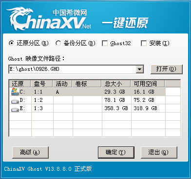 ChinaXV一键备份还原安全高效、稳定可靠,其设计更具人性化,一键就可完成所需操作,它具有安全、快速、保密性强、压缩率高、兼容性好等特点,特别适合电脑新手和担心操作麻烦的人使用。而且ChinaXV一键备份还原绿色免安装,能够备份还原,另具Ghost32等功能。