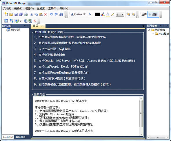 DataUml Design 是面向开发人员使用的一个永久免费的软件,提高软件的开发效率和代码的规范度。它主要包括三大功能,数据模型、代码生成和UML建模,数据模型功能类似于PowerDesigner软件,代码生成类似于动软的代码生成器。