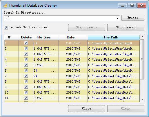 Browser 整个硬碟或是特定资料夹,勾选 Include Subdirectories 让他扫瞄所有的子资料夹,Start Search 开始扫瞄,扫瞄完成后会出现列表清单,全部选取之后 Clean 就大功告成。