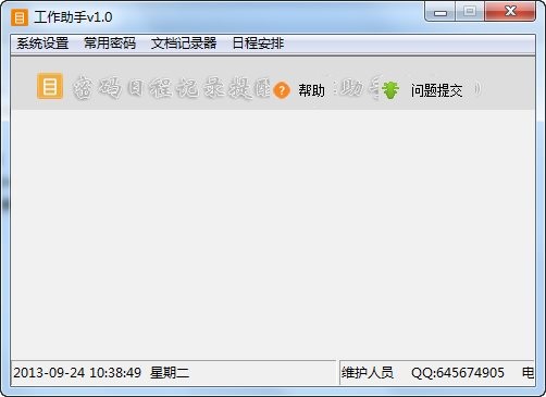 工作助手是一款帮助用户更轻松完成工作及日常计划的一款软件,具有操作简单、使用方便、自动升级、功能定期增加等特点。目前功能包括:常用密码加密记忆、日常文档记录、安排工作日程短信提醒、 自动升级等功能。