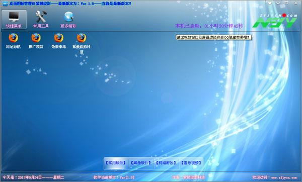 桌面图标管理能对常用软件、娱乐软件、网络游戏、音乐视进行快捷设置管理,桌面图标管理还有定时计划、网址转IP、高级记事本、锁定注册表等工具。如果您还在为桌面混乱而头疼,那么就下载紫枫俊影桌面图标管理试试吧。