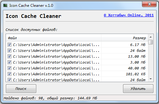 这个小程序启动后,自动搜索所有图标缓存文件并列表,点击"Удалить" 然后重启系统即可,需要管理员权限运行。