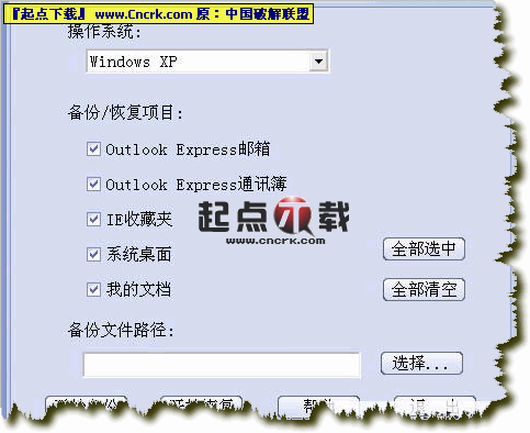 本软件是在需要重新安装Windows XP操作系统时,对系统常用、易忘的资料进行自动备份或恢复。包括“Outlook Express邮箱”、“Outlook Express通讯簿”、“IE收藏夹”、“系统桌面”、“我的文档”。而且用户可以根据需要自行选择备份或恢复项目。
