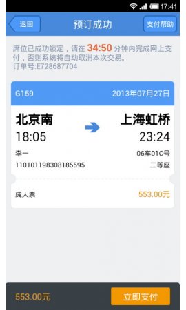 5、乘车人添加完成后,点击立即预订按钮,预订动车票。预订成功后跳转到信息确认界面,信息确认无误后,点击立即支付按钮进行支付操作