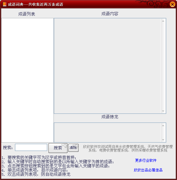 多功能成语操作单间,搜索的关键词有两种形式,即拼音和汉字,并且输入的关键字会自动搜索到有关成语,多功能成语词典还能展开成语接龙,有趣又好玩,是款不错的成语查询工具。
