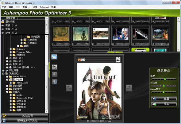 Ashampoo Photo Optimizer 还是一个快速的图像查看程序,具有完整的资源管理器样式的目录视图,其中可显示计算机上的所有驱动器和文件夹,以便迅速访问。这也适用于数码相机,从而可 在相机连接至计算机后查看其中的图像。可在 Windows 资源管理器中右键单击任何照片文件,以将其载入 Photo Optimizer 并进行即时编辑。