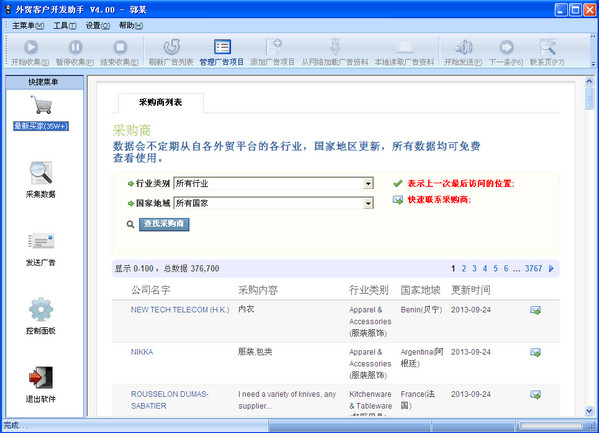 有了外贸客户开发助手后,收集客户联系资料,发送广告内容将变的简单一体化,鼠标点点即可完成。如果你还在愁怎么发展国外潜在客户,如果你对网络营销并不那么精通,别担心,这一切都交给外贸客户开发助手,你要做的只是配置联系信息和广告内容,接着就是坐在电脑前喝咖啡和点击鼠标即可。