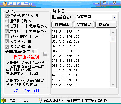 模拟按键器通过模拟键盘、鼠标操作可完些固定重复的键盘鼠标操作。此款模拟按键是由阳光工作室所制作的,模拟器绿色安全,欢迎下载使用!