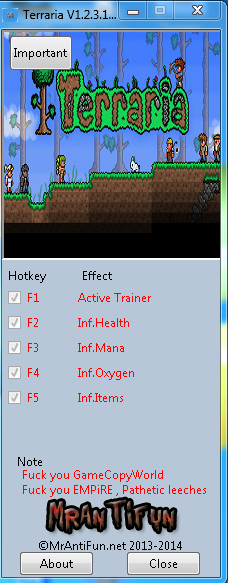 泰拉瑞亚修改器是一款用于沙盒游戏《泰拉瑞亚》的属性修改器,可以修改游戏中的多项属性,包括无限生命,无限魔法,无限氧气,无限物品等属性修改,使用之后即可让玩家更好的享受游戏的乐趣。