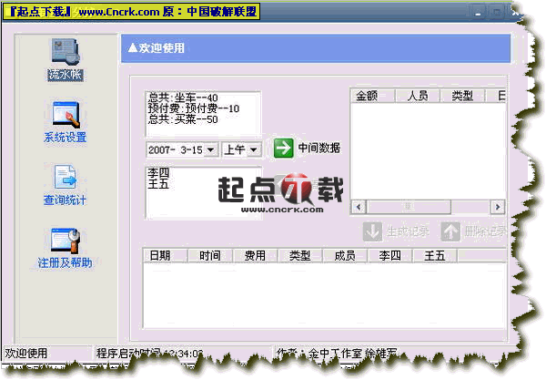 AA制费用分摊软件是一款绿色软件。主要用于集体活动后的费用分摊.包括记流水帐、软件设置、费用查询等功能..