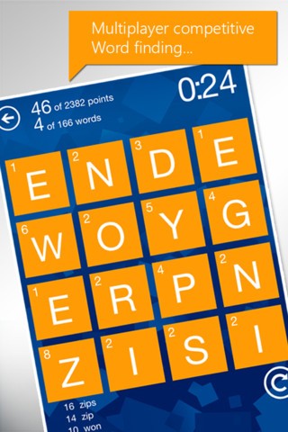 拼字游戏(Wordament)是一款微软XBOX360平台移植到安卓上的益智游戏,这款游戏可以与网络上的玩家互相对战,每轮游戏中包含各种挑战,如两个或三个字母的拼字赛,主题单词赛,速度赛等等。您可以在许多方面成为冠军:尽可能找到最多的单词,取得最好的分数,找到最长的单词,超过您的盟友,或打破自己的最高得分纪录。如何获胜取决于自己。
