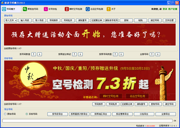 极速号码魔方2013发布了,整理数据更简单、更快速、更准确,会预测实号\空号\关机\停机比例,号码魔方提供最新全国号段和最专业的号码选择方案,您还在为处理海量号码而烦恼吗?您还在为企业宣传而没有号码资源而烦恼吗?您还在为海量数据中存在大量无效数据而烦恼吗?现在立刻注册并体验极速号码魔方2013给您带来的便利吧。