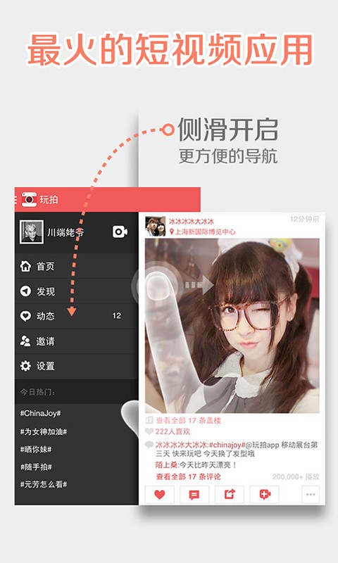 赶超陌陌,微信,微博的6秒视频社交软件,这里等着你的,是美妞、萌宠,更有创意搞笑视频和旅行美好风光。快来下载,争做交友时尚达人,用玩拍记录你生活中的点点滴滴!