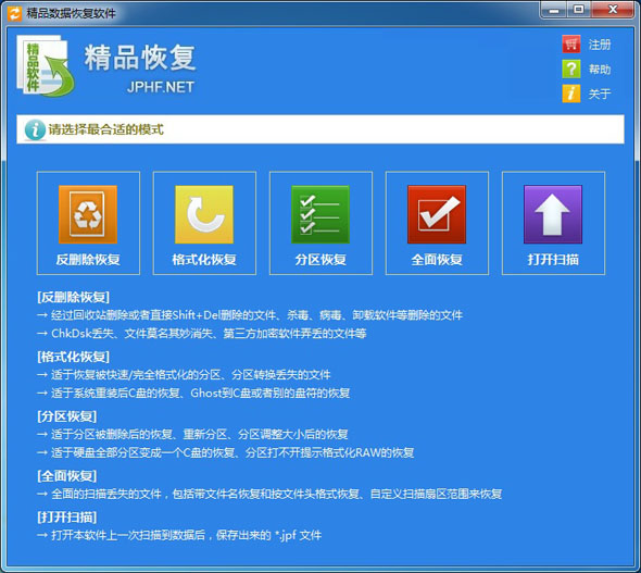 精品数据恢复软件是一款简单易用且有专业数据恢复水准的文件恢复软件,可以恢复误删除文件、误格式化分区、盘符消失、分区表破坏、U盘打不开、盘符双击提示格式化、分区报错说根目录损坏且无法读取、Ghost误装系统、重新分区、一键Ghost成4个分区、手机内存卡恢复、杀毒软件扫描后文件消失、回收站被清空、非法关机后磁盘自检而丢失的文件、根目录变空但是磁盘空间还是占用着等等情况。