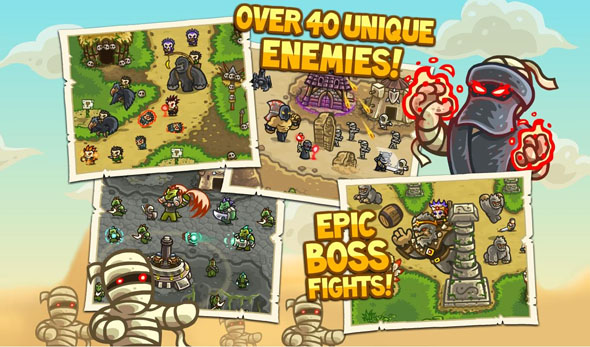 王国保卫战2:前线 Kingdom Rush Frontiers完整继承了1代固定路线塔防模式,将1代中为森林、雪山、熔岩三大场景搬移至了沙漠、山谷以及地下迷宫。配合游戏场景,2代增添了更为丰富的游戏元素,个别关卡的地形还会随着敌人来袭而发生变化,这也要求玩家在最开始建塔时考虑的更加周全。游戏依然分为campaign、heroic、iron challenge三种模式分别对应三种难度,其中heroic和iron模式仍需campaign三星才能解锁。