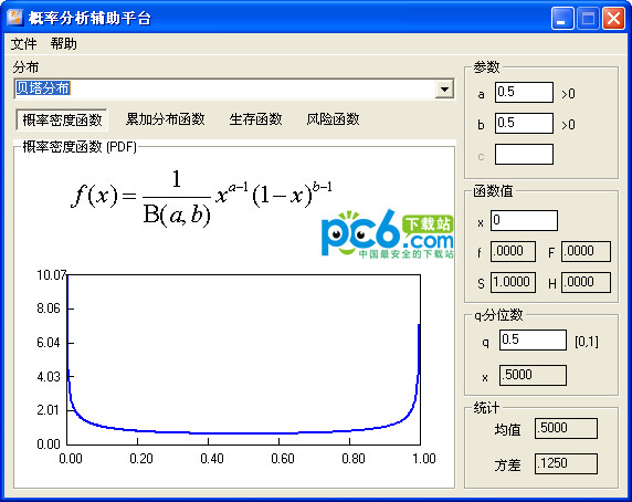 概率分析辅助平台计算和绘制概率密度函数、累加分布函数、生存函数和风险函数等,计算分位数、均值和方差。