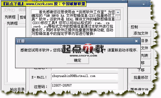 “RM RMVB RA文件剪辑信息(ID3)批量修改工具”是“田雨软件工作室”赠送给各位网友的礼物!他是 REAL 媒体文件的辅助剪辑信息(ID3)修改工具!您可以将REAL格式的 .ram、.rm .rmvb .ra 等格式文件的剪辑信息通过本软件进行批量修改,同时本软件还提供批量查找替换功能,自动对剪辑信息中的指定字串内容进行替换!