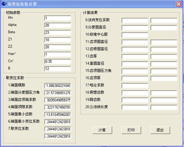 高变位齿轮计算,填入相关的参数,就能帮你完成一系列的计算。是齿轮设计或制作不错的辅助性软件。变位齿轮计算一个很小的高变位齿轮计算软件,无需安装,解压后不到60k,可用于已知模数、齿数,求高变位齿轮的变位系数、压力角、啮合系数、跨齿数、齿顶圆、齿根圆等。
