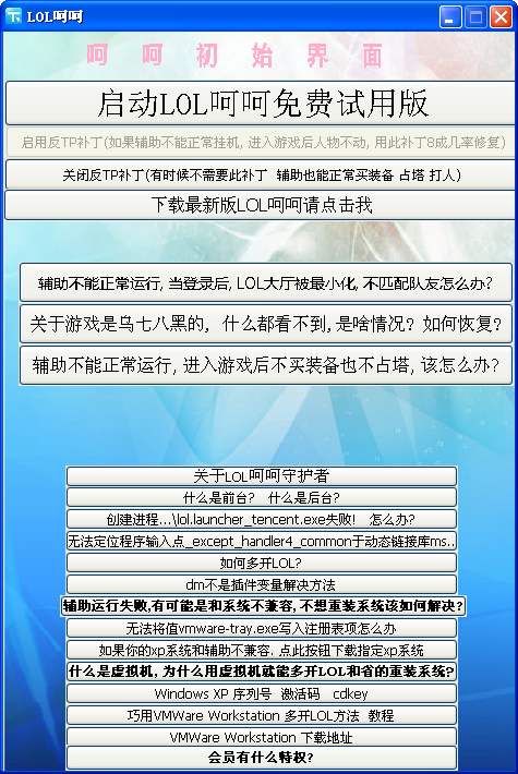 lol呵呵辅助是一款英雄联盟游戏的辅助工具,lol辅助提供快速挂机刷金币、自动出推荐装备、自动回城等功能,本版本为免费试用版,可以免费使用。