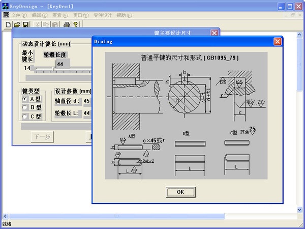 2、菜单选择:零件设计>键设计|键校核|弹簧设计 根据提示输入相关数据 最终得到结论