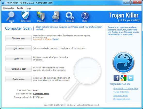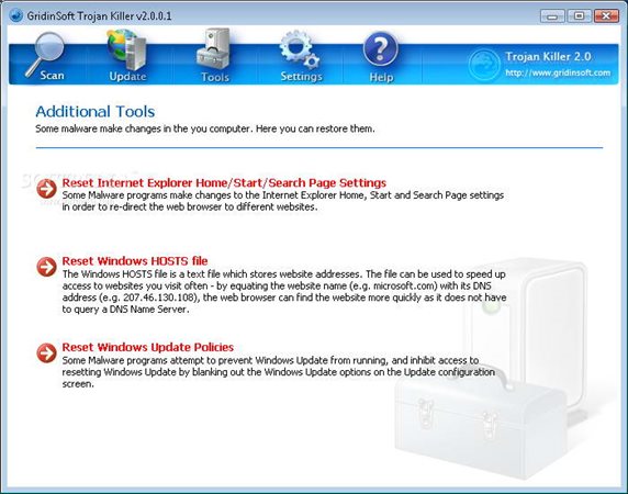 Gridinsoft Trojan Killer木马克星是专门来禁用/删除没有用户不必手动编辑系统文件或注册表的恶意软件。该方案还删除一些恶意软件进行了一些标准的防病毒扫描器忽略额外的系统修改。【软件特点】