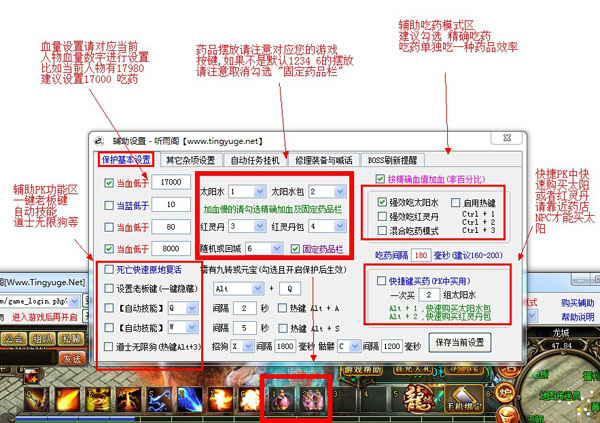 PK保护、远程买药、远程开启NPC、挂机、定时吃双、BOSS刷新提醒、自动喊话、自动拾取物品、战士挂机打钱、法师多点挂机、自动1-45主线任务等。【更新日志】