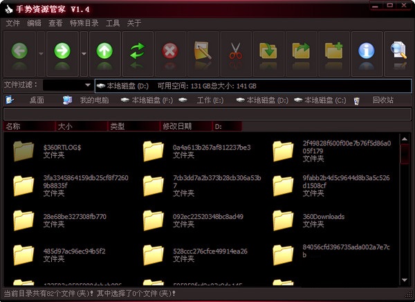 手势资源管家鼠标手势支持,使文件操作极简极快极方便(前进、后退,返回上级目录、上下翻页等,具体手势请看帮助菜单)。