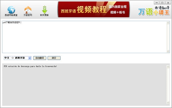 万语小译王西班牙语翻译是一款可以将中文转换为西班牙语或西班牙语转换为中文的汉化软件西班牙语翻译器,输入想要被翻译的文字,然后点自动翻译即可。