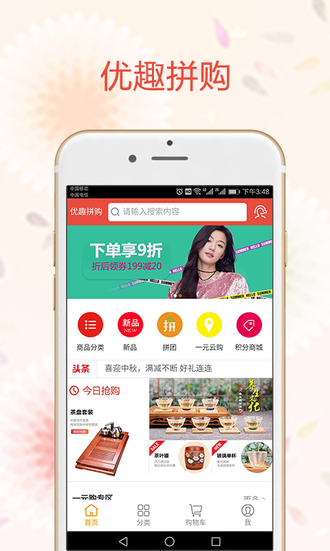 用户通过发起和朋友,家人,邻居等的拼团,以更低的价格,拼团购买商品。旨在凝聚更多人的力量,用更低的价格买到更好的东西,体会更多的实惠和乐趣。每日精选,特卖上新!用优惠价格尽享品质生活!