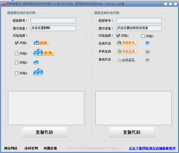 网钛旺旺号/旺旺群在线状态代码只要输入旺旺群号或旺旺账号便可成生成状态代码,并有可设置提示信息,有几种风格任你挑选,是一个非常简单好用的阿里旺旺代码生成工具。