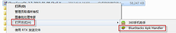 注意:右键点击游戏apk图标,选择打开方式->BlueStacks APK handler 即可安装。