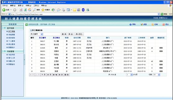 系统提供了功能强大的模板导入功能,方便对每次员工集中体检后大量数据的批量录入。为方便个人信息查询,系统提供了不可逆加密和首次登录修改密码的使用措施,所有访问登录都有日志记录,通过这些手段来提高信息安全性和保密性。同时系统提供了灵活的查询和图表统计功能,为管理员全面掌握企业员工健康状况提供依据。【软件特点】