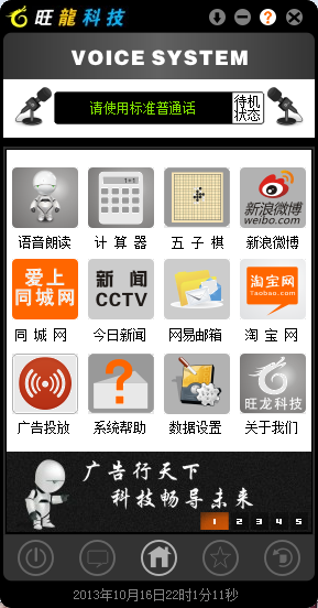 智能语音系统是旺龙科技推出的一款智能应用系统,配合电脑操作使用,其主要功能用于语音控制电脑,实现电脑与人的互动,语音输入功能,语音识别功能,语音朗读功能,网络智能应用五大重要作用,安装在电脑上面,不仅方便快捷,而且可以增添乐趣。