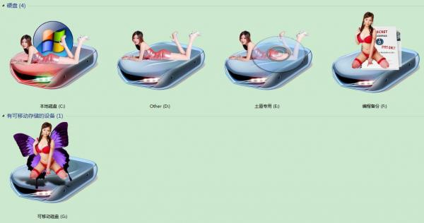 【概括介绍】硬盘图标美化程序提供了九种美化方案选择,只需一键就可以将硬盘图标编程美女,喜欢个性的、想与众不同、那么硬盘图标也不例外,都要尽显自我的特别。硬盘图标美化易用,操作简便,并且支持恢复系统默认图标,请放心使用。