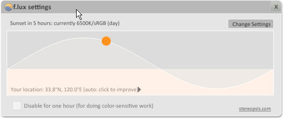 3、之后,就让 f.lux 自动运行吧,f.lux 会随着时间而改变色温