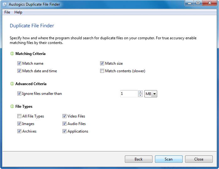 Auslogics Duplicate File Finder 是 Auslogics 公司出品的重复文件查找工具。它可以快速查找指定磁盘上的重复图像、音频、视频、文档、应用程序或任意文件,直接删除或压缩到软件内置的急救中心,以此释放磁盘空间。