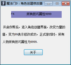 开启作弊后,进入角色创建界面,改变力量值,变为99表示修改成功,正式游戏时,所有人物所有技巧属性为9999。