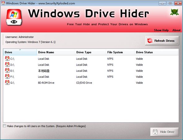 运行Windows Drive Hider后,在界面中选择某个硬盘分区,点击“hide drive”,然后注销或者重启Windows即可。