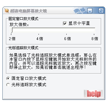 一,固定窗口放大模式:本模式下,光标附近的内容实时放大显示在本软件窗口内,可以提供2倍-8倍的放大效果,足以满足您的需求,同时提供了十字准星选项供选择,方便瞄准校对特殊内容!
