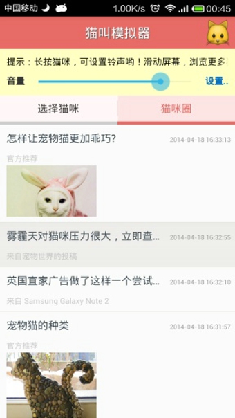 有了安卓猫叫模拟器,立刻去逗逗您家的小猫咪,用模拟可爱的猫咪的声音,可以跟您的宠物互动噢。猫叫模拟器这个应用,可以用来模拟您的宝贝小猫咪甜美的声音呢,可以看到您家猫咪可爱的表情和反应哟:)