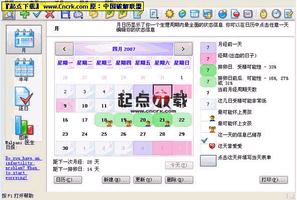 关于女性日历(4WomenOnly)软件的详细简介:为女性设计的日历软件,能提醒要到来的经期和排卵期,预测胎儿的性别和生日。能够保存几个日历,密码保护,统计,打印和输出。多语言版本。