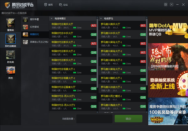 2、然后选择您要玩的游戏类别,分为魔兽类别、即时战略类、射击类和其他。我以魔兽争霸3为例讲解。选择【魔兽类】-【魔兽对战】,选一个服务器。然后点击【确认】。