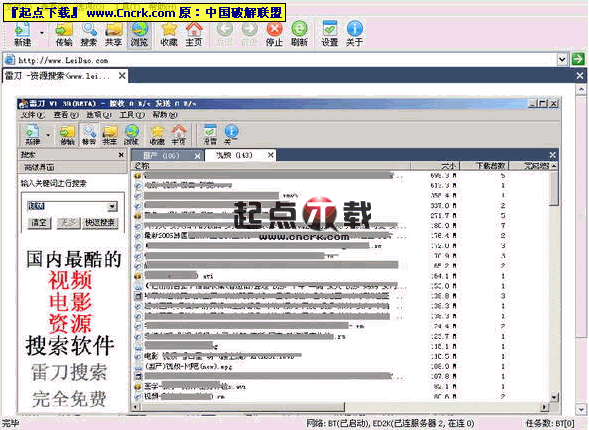 雷刀软件拥有全球最大的共享网络资源,采用最先进的P2P技术开发,集合Emule+BT功能,拥有全球所有的EMULE和BT资源。在这里几乎所有的电影、音乐、小说、图片资源都能找到踪迹。利用他的卓越特性,我们可以与全世界的网友共同分享资源,充分享受自由共享的乐趣!软件小巧精悍,功能强大,对EMULE和BT内核做了大量的优化和改进,是目前消耗电脑资源最少,性能最稳定,容量最小的一款P2P绿色软件