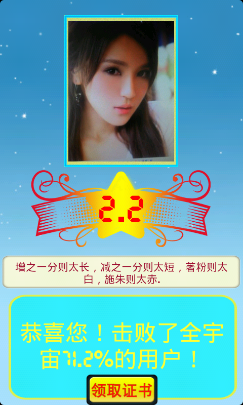 美丑相机是一款计算个人长相的手机娱乐应用。想知道自己的长相到底如何?感觉对方不如你帅/美他/她确不肯承认?美丑照相机安卓版采取精密的算法,可以计算出你的长相。更有pk模式,让你和朋友们一比高低!帅哥还是青蛙,美女还是恐龙,真相只有一个!