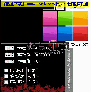 获取屏幕上任一显示点的颜色。自动复制色值到剪贴板,按WEB色值、RGB值、HEX值选择自动复制值的类型。获取指定显示点的窗体句柄、窗体类名、窗体标题功能。