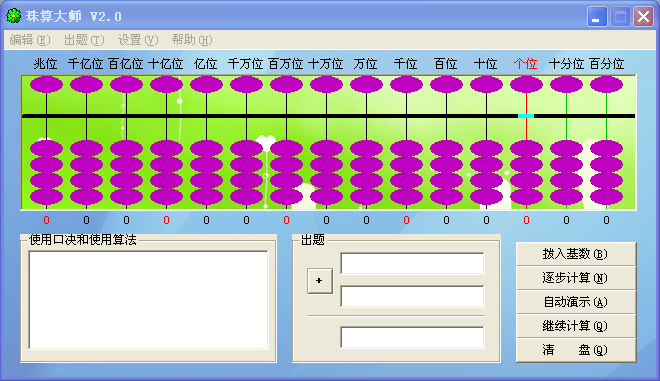 珠算大师内有加法、减法、乘法、除法四则运算,并配备有相应的口诀,珠算大师和现代的计算器比价起来,显得趣味丛生,而且也非常实用。