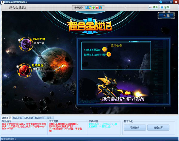 超合金战记3神魔辅助是魔王辅助的附属辅助,所以叫魔神或神魔都可以,超合金战记3神魔辅助提供修改攻击、按Q超级加速、秒每周BOSS、药箱子超强回血、修改经验、修改G币等功能,欢迎下载体验。