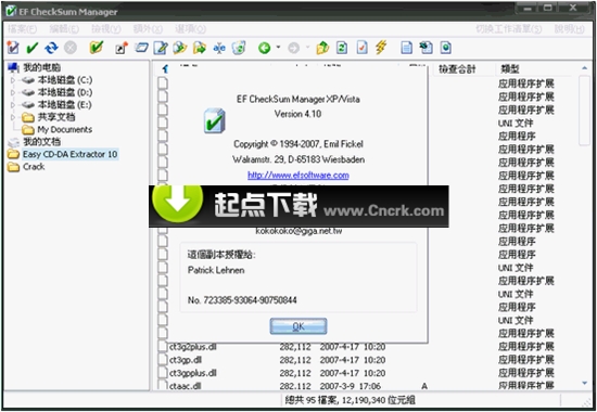 EF CheckSum Manager(SFV及MD 验证) V4.40 绿色版 EF CheckSum Manager 是一个可以帮你检查你文件的标准 SFV 及 MD5 格式的数值,以确认该文件是否有遭受到他人的变动及修改,例如有些软件公司在提供文件给他人下载时,会告知该文件的 MD5数值,当你下载该文件后,便可以使用 EF CheckSum Manager 来检查其 MD5 数值是否与软件公司公布的相同,如此可确认所下载的文件是否遭受他人更改,若有所不同时,为防止他人更改该文件时放入病毒,我们建议你不要执行使用该文件。