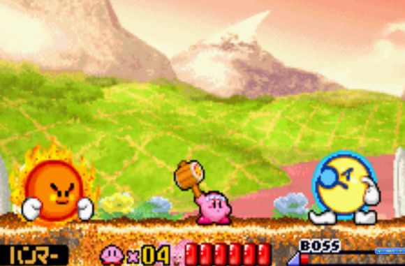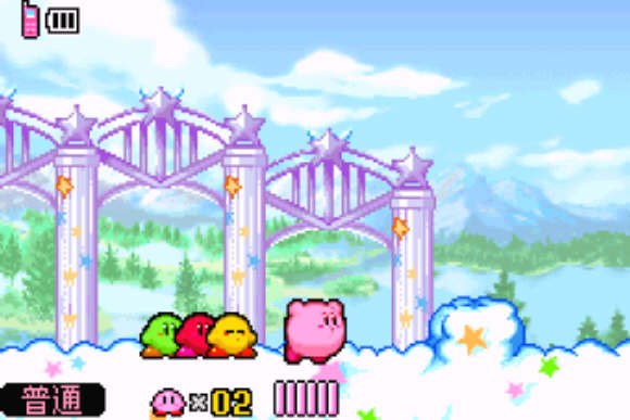 A键为跳,再按一下就会含一口气在肚子里,可以飞起来。从高处(2/3个屏幕高)掉下来,就会大头朝下落,这样也是有攻击力的。在肚子鼓起来的时候按B键是吐气,有攻击力的,攻击距离很短。在肚子空的时候按B键是吸气,可以吞掉敌人,就算是有墙隔着的地方也可以吸到。如果是吸到有特殊能力的敌人,按一下十字键的下键就可以复制敌人的能力。吸入两个敌人再按下键,就可以用轮盘选择能力,等它自动停下来的话,是大锤能力;吸入两个敌人后喷出,喷出的星星有穿透效果。(如果将星星和敌人同时吸入再使用,则使用星星的能力)如果蹲着按B键可以做出滑铲的动作。