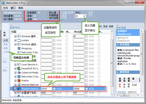 通过它,您可以直接来控制每个程序对Internet的访问以及流量分配情况。例如,您可以用NetLimiter来为单个程序甚至是单个网络连接限定其上载和下载速度。通过非常简单的设置,NetLimiter就可以让你随心所欲地在各个程序之间分配网络带宽。